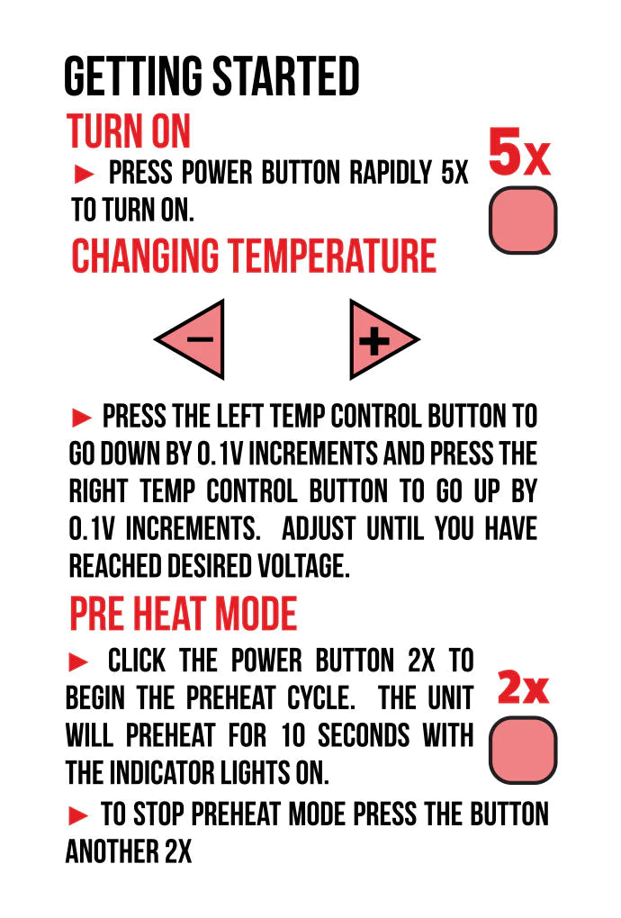 HOW TO BEGIN: To turn on or turn off the device, a straightforward five presses of the power button are all that’s needed. Use the left temperature control button to decrease the voltage in 0.1V steps and the right button to increase it in 0.1V increments. Continue adjusting until you reach your preferred temperature.
