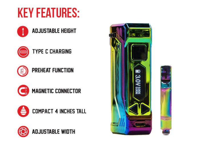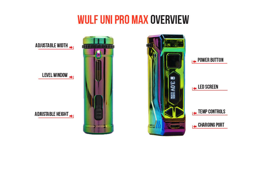 Introducing the most recent addition to the vape lineup, the UNI Pro Max Concentrate Kit. This stylish gadget combines compact design with exceptional power, measuring a mere 4 inches in height. Its adjustable width and height, along with a 510-thread magnetic connector, ensure convenience and versatility.