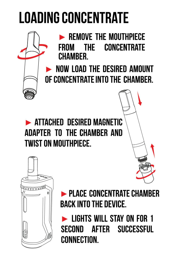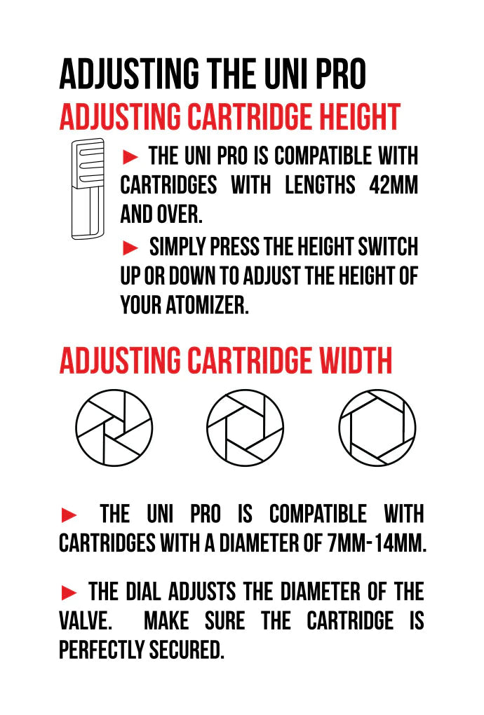 LOADING CONCENTRATES: Commence by separating the mouthpiece from the concentrate chamber. Then, load the desired quantity of concentrate into the chamber. Next, attach the magnetic adapter of your preference to the chamber and firmly secure it by twisting it onto the mouthpiece. Finally, reattach the concentrate chamber to the device. Once the connection is established, the lights will briefly remain lit. ADJUSTING HEIGHT: The UNI Pro Max is designed to accommodate cartridges that measure 42mm in length or longer. Modify the atomizer’s height with ease by using the dedicated button to raise or lower it, enabling convenient customization.