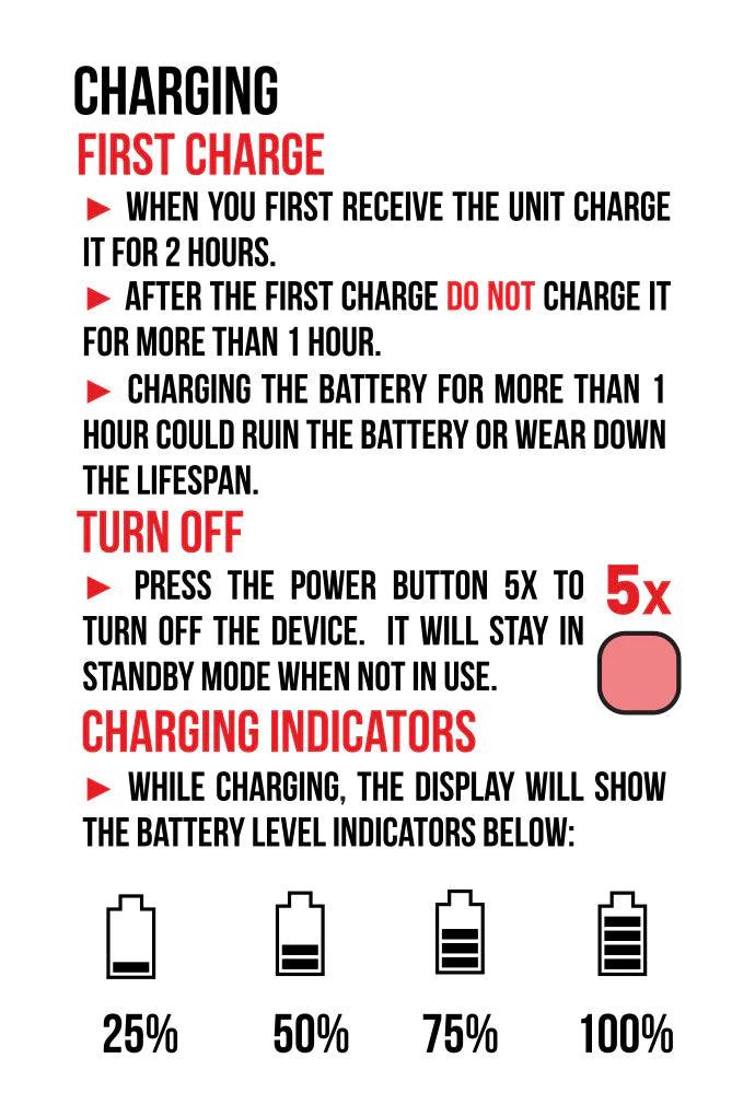 CHARGING INSTRUCTIONS: Upon receiving the unit, it’s essential to charge it for a duration of two hours during the initial charge. However, subsequent charges should not exceed one hour, as this could potentially harm the battery life. While in the charging process, the display will provide you with the current battery level.