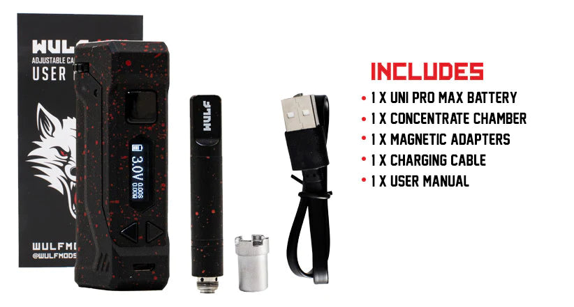 x1 UNI Pro Max Box Mod x1 Concentrate Chamber x1 Magnetic Adapter x1 USB Type- C Cable x1 User Manual