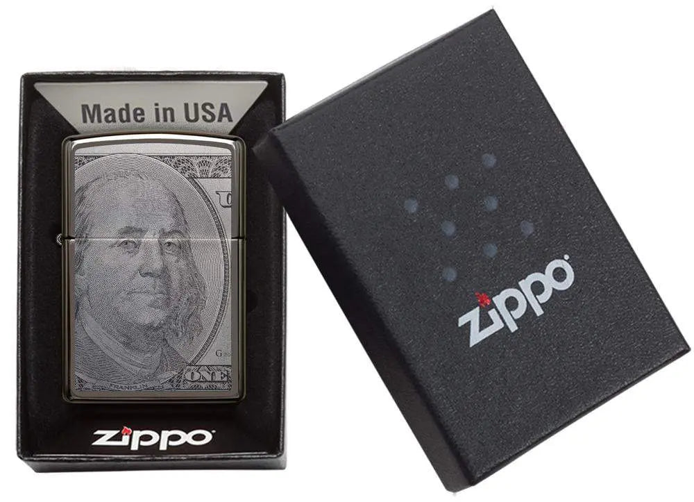 “It’s all about the Benjamin’s, baby”. Who doesn’t want our dollar on a Zippo? If they can’t flaunt a stack of $100s, this Black Ice lighter Photo Imaged with a Benjamin on front and back is the next best thing. Comes packaged in a gift box. For optimal performance, fill with Zippo lighter fluid.